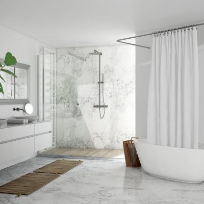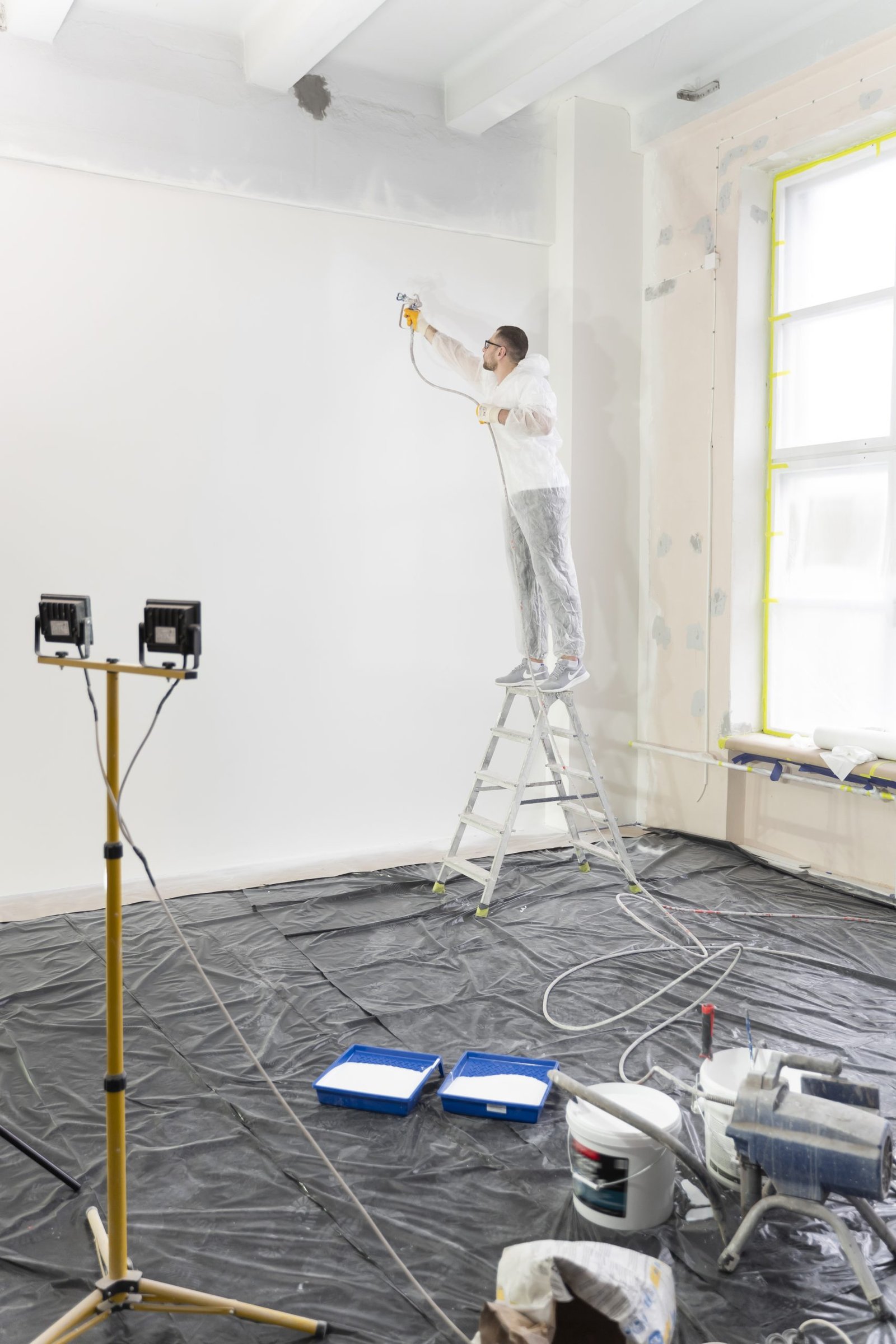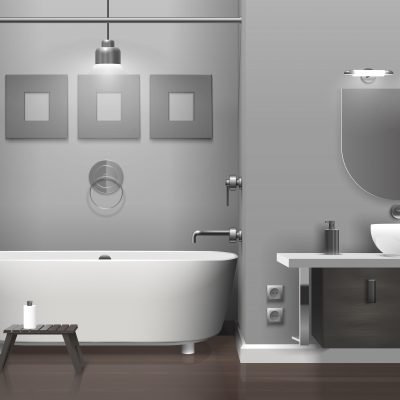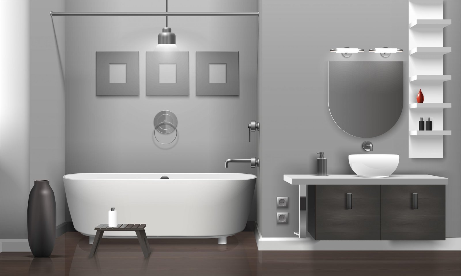 A person wearing yellow rubber boots with high-pressure water nozzle cleaning the dirt in the tiles plasterer man works plastering two trowels on plasterboard in blue uniform House isolated in the field A beautiful shot of a modern house kitchen Realistic bathroom interior with white tub and sink, decor on grey wall, vase on floor vector illustration